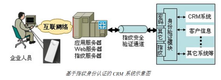 基于生物识别技术的CRM指纹身份认证系统应用模式如下: