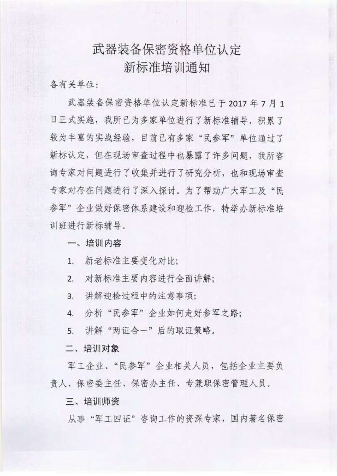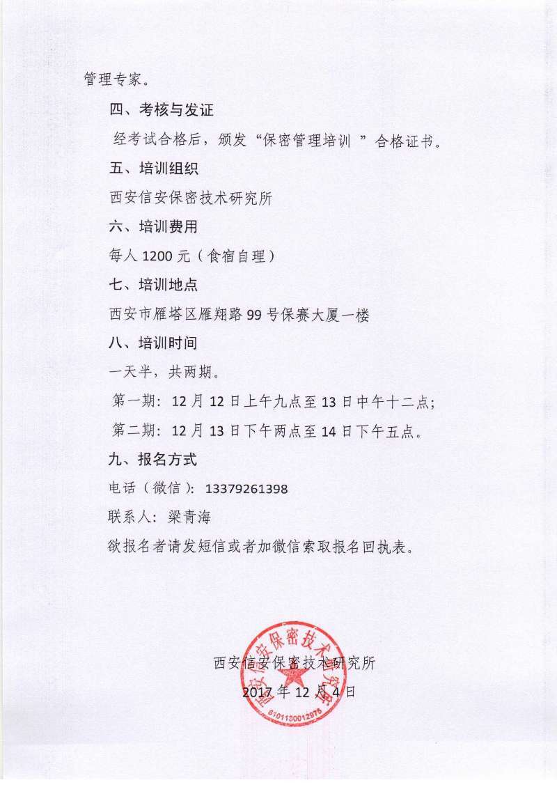 各有关单位: 武器装备保密资格单位认定新标准已于2017年7月1日正式实施,西安博宇光电科技发展有限公司(西安信安保密技术研究所)已为多家单位进行了新标准辅导,积累了较为丰富的实战经验,目前已有多家“民参军”单位通过了新标认定,但在现场审查过程中也暴露了许多问题,我所咨询专家对问题进行了收集并进行了研究分析,也和现场审查专家对存在问题进行了深入探讨。 为了帮助广大军工及“民参军”企业做好保密体系建设和迎检工作,特举办新标准培训班进行新标辅导。 一、培训内容 1.新老标准主要变化对比; 2.对新标准主要内容进行全面讲解; 3.讲解迎检过程中的注意事项; 4.分析“民参军”企业如何走好参军之路; 5.讲解“两证合一”后的取证策略。 二、培训对象 军工企业、“民参军”企业相关人员,包括企业主要负责人、保密委主任、保密办主任、专兼职保密管理人员。 三、培训师资 从事“军工四证”咨询工作的资深专家,国内著名保密管理专家。 四、考核与发证 经考试合格后,颁发“保密管理培训 ”合格证书。 五、培训组织 西安博宇光电科技发展有限公司(西安信安保密技术研究所) 六、培训费用:每人1200元(食宿自理) 七、培训地点:西安,西安博宇光电科技发展有限公司(西安市雁塔区雁翔路99号保赛大厦一楼) 八、培训时间:一天半(共两期),12月12日上午九点至13日中午十二点,12月13日下午两点至14日下午五点) 九、报名电话(微信)13379261398(梁青海所长助理,欲报名者请发短信或者加微信索取报名回执表)