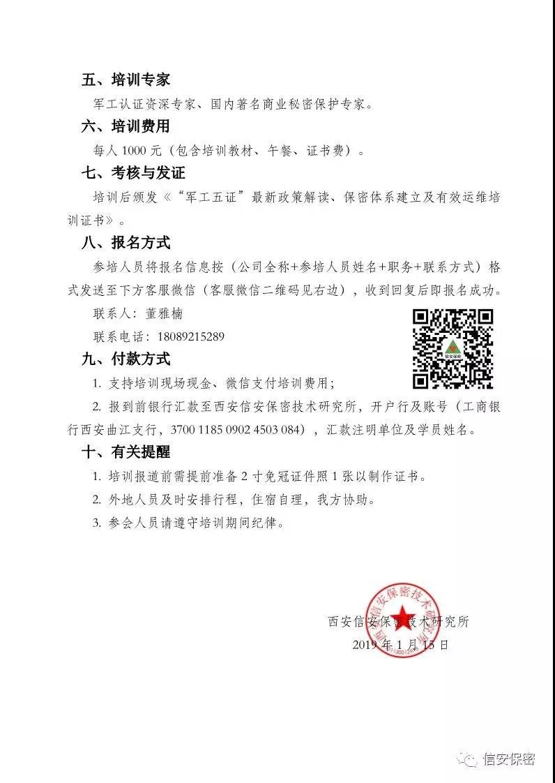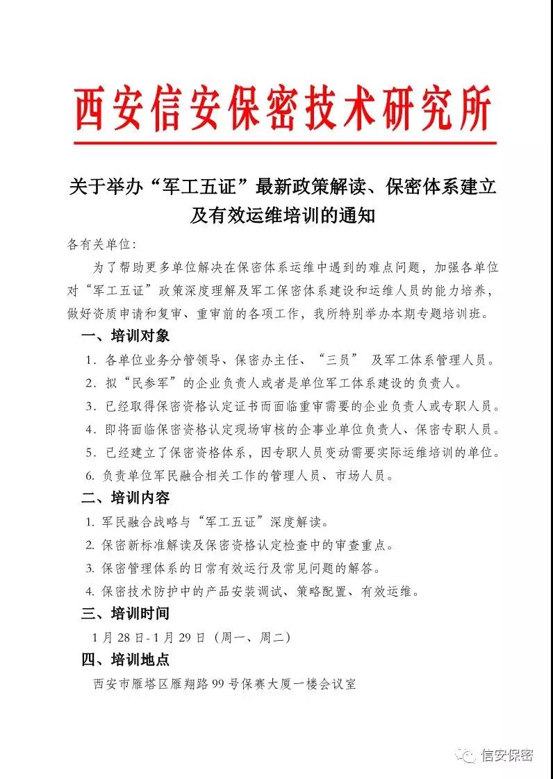 关于举办“军工五证”最新政策解读、保密体系建立及有效运维培训的通知