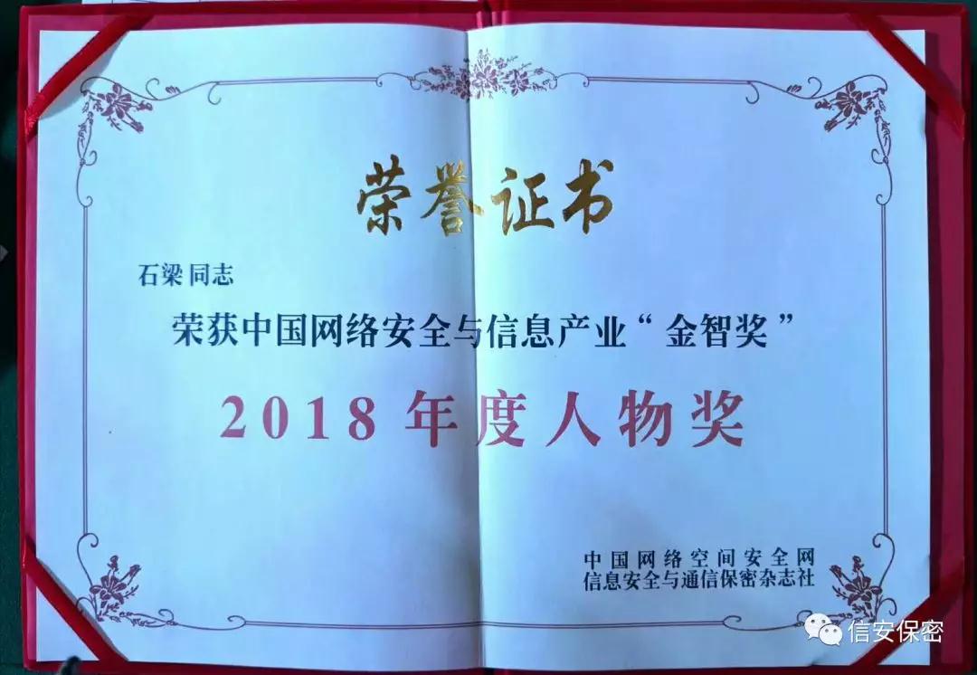 石梁是西安信安保密技术研究所所长。国家保密学院特聘教授,陕西省委保密局“保密宣讲大队”授课专家,年行程十几万公里,讲课上百场,在全国各地宣讲军民融合和网络安全国家战略。同时为退役军人做创就业公益讲座,乐此不疲,以苦为乐,他是一个“乐行客”,他是一个布道者。 “金智奖”评选出的“十大金智产品奖”“十大金智企业奖”“十大金智人物奖”等系列奖项在过去的两年时间里已经成为行业普遍认可的荣誉,参与各奖项角逐的企事业单位和个人也逐年增多。参加本届“金智奖”评审工作的专家评委达到100位,有1000位专业评委参与推选。经评委评选,西安信安保密技术研究所所长石梁获得信息安全与通信保密杂志社主办的中国网络安全与信息产业“金智奖”2018年度人物奖。