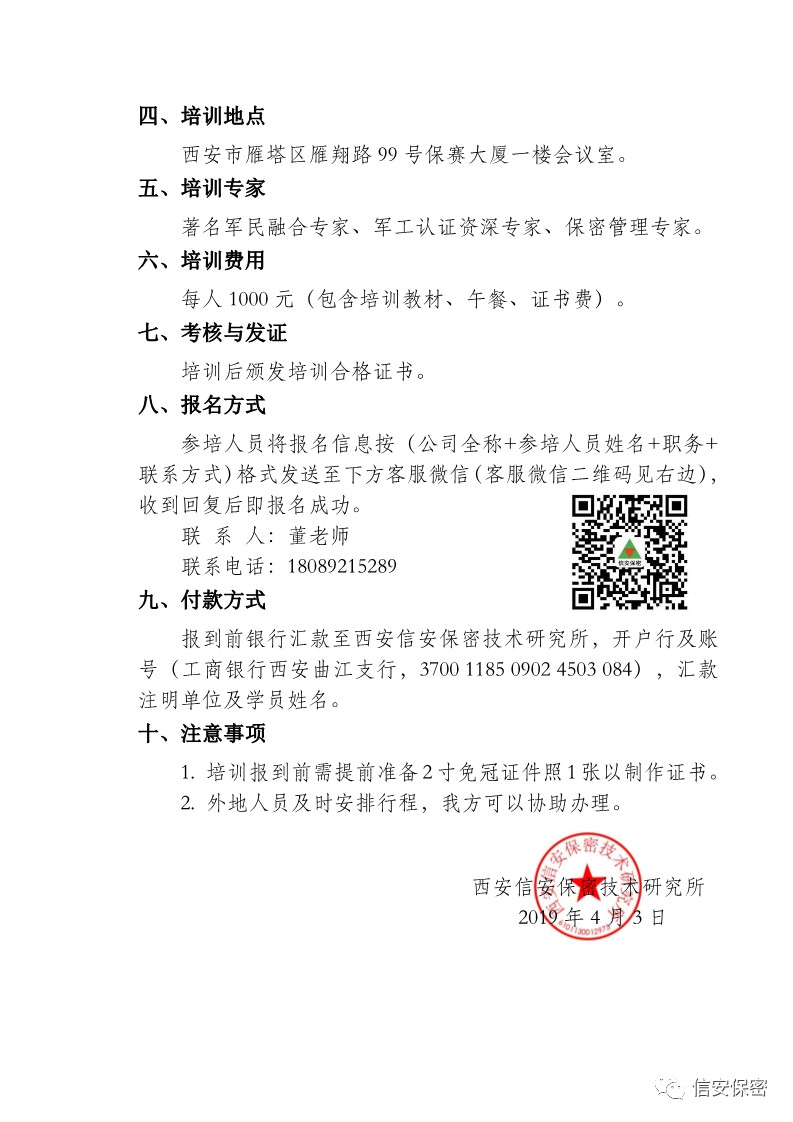关于举办“军工五证”最新政策解读、保密体系建立及有效运维培训班(总第三十三期)的通知 各有关单位: 为了帮助更多单位解决在保密体系运维中遇到的难点问题,加强各单位对军民融合政策深度理解及军工保密体系建设和运维人员的能力培养,做好资质申请和复审、重审前的各项工作,我所特别举办本期专题培训班。 一、培训对象 1.各单位业务分管领导、保密办主任、“三员” 及军工体系管理人员。 2.“民参军”的企业负责人或者是单位军工体系建设的负责人。 3.已经取得保密资格认定证书而面临重审需要的企业负责人或保密人员。 4.即将面临保密资格认定现场审核的企事业单位负责人或保密人员。 5.已经建立了保密管理体系,因保密人员变动需要实际运维培训的单位。 6 . 负责单位军民融合相关工作的管理人员、市场人员。 二、培训内容 1. 军民融合战略与“军工五证”深度解读。 2. 保密新标准解读及保密资格认定检查中的审查重点。 3. 保密管理体系的日常有效运行及常见问题的解答。 4. 保密技术防护中的产品安装调试、策略配置、有效运维。 三、培训时间 4月15日-4月16日(周一、周二) 四、培训地点 西安市雁塔区雁翔路99号保赛大厦一楼会议室 五、培训专家 著名军民融合专家、军工认证资深专家、保密管理专家。 六、培训费用 每人1000元(包含培训教材、午餐、证书费)。 七、考核与发证 培训后颁发培训合格证书 八、报名方式 参培人员将报名信息按(公司全称+参培人员姓名+职务+联系方式)格式发送至下方客服微信(客服微信二维码见下方),收到回复后即报名成功。 联系人:董老师 联系电话:18089215289 九、付款方式 报到前银行汇款至西安信安保密技术研究所,开户行及账号(工商银行西安曲江支行,3700118509024503084),汇款注明单位及学员姓名。 十、注意事项 1. 培训报到前需提前准备2寸免冠证件照1张以制作证书。 2. 外地人员及时安排行程,我方可以协助办理。