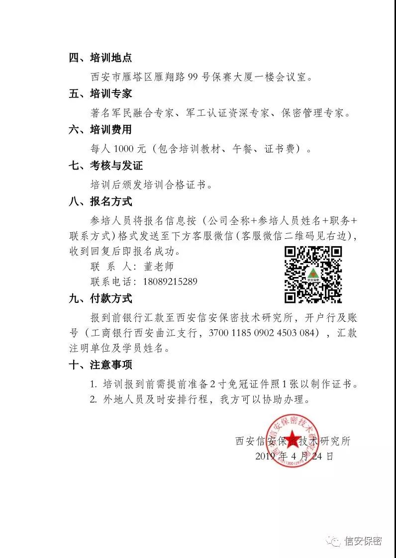 为帮助更多“民参军”企业解决保密人才急需的问题,我公司常态化举办“‘军工五证’最新政策解读、保密体系建立及有效运维培训”的活动。 往期来自全国各地的参训人员反映听课后收获很大,被誉为国内军工体系建立与运维最好的培训,有的单位学完本期,下期还继续派人来参加培训,因为会有十大收获: 一是搞清楚了军民融合的真正本质; 二是知道了如何快速取得保密资质; 三是会避免取证走弯路和上当受骗; 四是弄明白了军工认证的真正用途; 五是学会了如何建设各类保密体系; 六是掌握了保密管理运维方法意义; 八是对保密新标准有了准确的了解; 九是澄清了很多原来有的模糊认识; 十是结交了来自全国各地的新朋友。 前 言 随着国家军民融合发展战略的不断推进,已取得保密资质的企业越来越多。仍有很多民企想“参军”,需要取得保密资质,但在实施过程中出现了很多问题,例如: 准备办证的企业:抱着过去的“关系思维”,认为找人花钱即可取得保密资质;对办证条件不了解,对服务市场不了解,上当受骗事件较多;不知道应该如何做保密技术防护,不知道应该配备哪些保密产品。 正在办证的企业:不了解《办法》和《标准》,不知如何取得“秘密等级建议表”;不懂得如何高效的建立保密体系,办证时间过长,甚至超过一年。 已取得保密资质的企业:按老标准取证的企业,对新标准没有系统的学习,也没有按新标准完善管理体系;“重取证轻管理”、保密管理漏洞多、保密风险巨大;保密管理人员流动性大,换人后没有及时对新人进行培训。 针对以上存在的问题,我公司特举办培训班,为各企业排忧解难,欢迎各企业派相关人员前来参加。   关于举办“军工五证”最新政策解读、保密体系建立及有效运维培训班(总第三十五期)的通知 各有关单位: 为了帮助更多单位解决在保密体系运维中遇到的难点问题,加强各单位对军民融合政策深度理解及军工保密体系建设和运维人员的能力培养,做好资质申请和复审、重审前的各项工作,我公司特别举办本期专题培训班。 一、培训对象 1.各单位业务分管领导、保密办主任、“三员” 及军工体系管理人员。 2.“民参军”的企业负责人或者是单位军工体系建设的负责人。 3.已经取得保密资格认定证书而面临重审需要的企业负责人或保密人员。 4.即将面临保密资格认定现场审核的企事业单位负责人或保密人员。 5.已经建立了保密管理体系,因保密人员变动需要实际运维培训的单位。 6 . 负责单位军民融合相关工作的管理人员、市场人员。 二、培训内容 1. 军民融合战略与“军工五证”深度解读。 2. 保密新标准解读及保密资格认定检查中的审查重点。 3. 保密管理体系的日常有效运行及常见问题的解答。 4. 保密技术防护中的产品安装调试、策略配置、有效运维。 三、培训时间 5月9日-5月10日(周四、周五) 四、培训地点 西安市雁塔区雁翔路99号保赛大厦一楼会议室 五、培训专家 著名军民融合专家、军工认证资深专家、保密管理专家。 六、培训费用 每人1000元(包含培训教材、午餐、证书费)。 七、考核与发证 培训后颁发培训合格证书 八、报名方式 参培人员将报名信息按(公司全称+参培人员姓名+职务+联系方式)格式发送至下方客服微信(客服微信二维码见下方),收到回复后即报名成功。 联系人:董老师 联系电话:18089215289