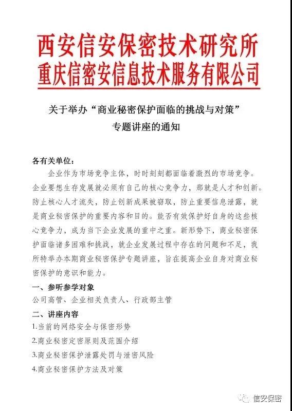 重庆信密安信息技术服务有限公司是西安信安保密技术研究所首个控股子公司,是一个服务于国家安全、围绕信息安全和保密一体化的综合服务平台,2017年1月16日注册成立,注册资金1000万元。 公司立足重庆,辐射全国,服务对象覆盖了军工、军队、政府、公检法司、院校、企业等各个领域,主要业务包括:信息安全保密教育培训、信息安全保密咨询服务、信息安全保密技术服务、信息安全保密产品服务、安全保密风险管理服务、信息安全保密项目实施。