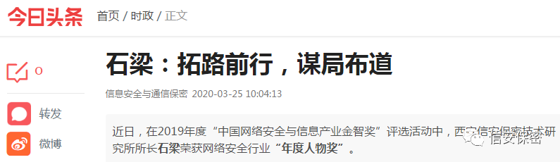 3月下旬,一篇名为“石梁:拓路前行,谋局布道”的文章被众多主流新闻媒体争相报道。文章中提到的不是别人,正是我们研究所所长石梁。 在2019年度“中国网络安全与信息产业金智奖”评选活动中,我研究所所长石梁荣获网络安全行业"年度人物奖",这也是他连续第四次获此殊荣。 多年来,石梁所长已为近千个单位提供了高质量的保密技术服务和信息安全保密讲座,并帮助数百家"民参军"企业取得了相关资质。2019年他对外授课128场,足迹遍布全国20多省市,行程15万公里,多次被评为优秀共产党员和陕西省级、西安市模范军转干部。