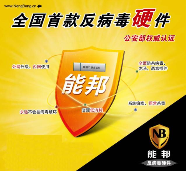 作为“全国第一款经公安部权威认证的反病毒硬件”,“能邦”结合了国内外反病毒产品的优点,经过业内广泛的交流、反馈和验证,在一些关键功能特性上超越了国内外反病毒产品,真正做到了“中国第一、唯一”的反病毒硬件产品。具有实时防杀病毒、木马、清理不良插件、自动打补丁、注册表清理、垃圾文件清理、能邦安全速递、硬盘健康指数检测等基本功能。