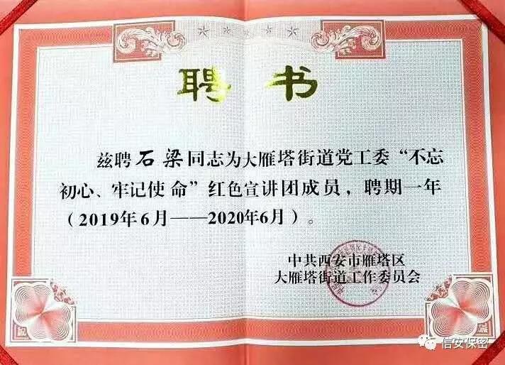 石梁所长被中共西安市雁塔区大雁塔街道工作委员会聘请为大雁塔街道党工委“不忘初心、牢记使命”红色宣讲团成员。