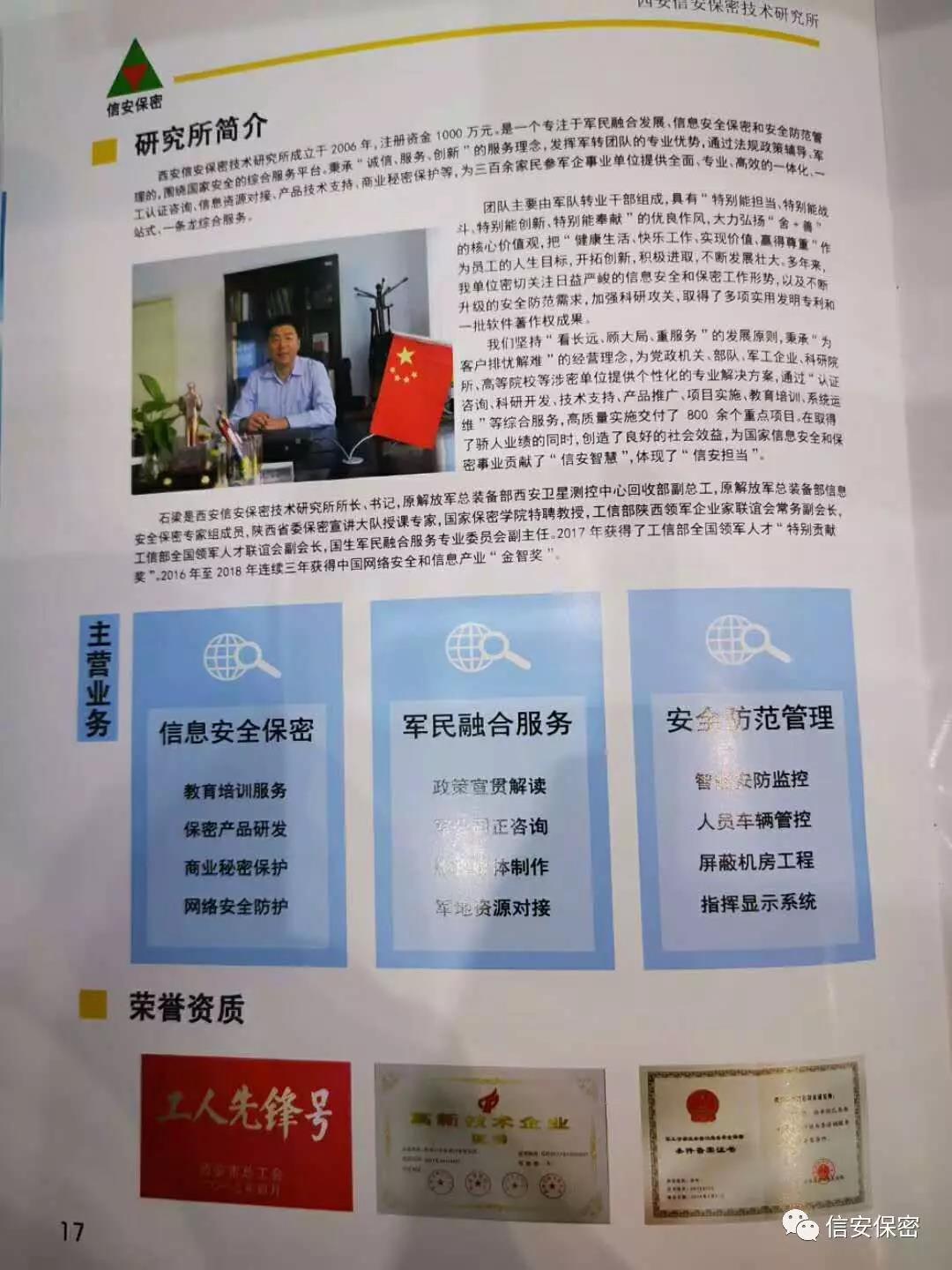 西安信安保密技术研究所成立于2011年,是一个围绕国家安全的综合服务平台,提供军民融合综合服务、网络安全和信息保密服务、安全防范管理服务,现已通过国军标认证,取得了军工三级保密资质、军工涉密业务咨询服务安全保密条件备案资质、国家信息安全工程服务资质、安防一级资质,取得了多项实用发明专利和软件著作权成果,研究所立足于西安,辐射全国,为800多家单位提供了高质量的信息安全保密和军民融合服务及相关教育培训服务。