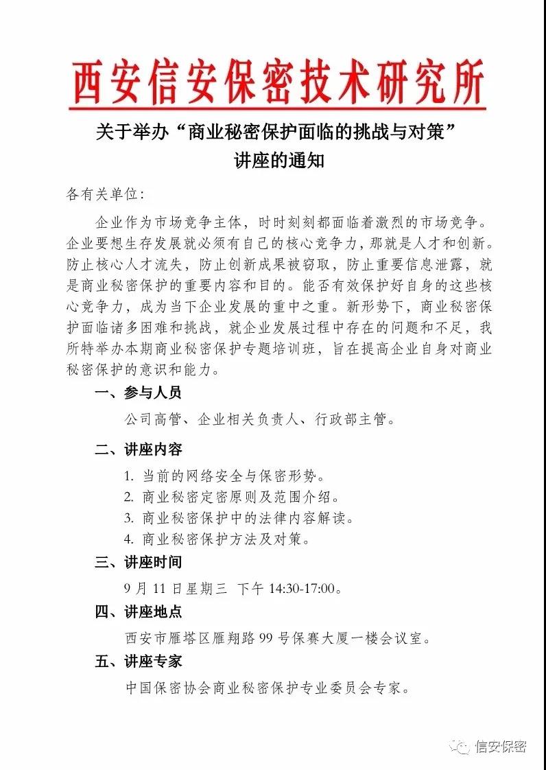 关于举办“商业秘密保护面临的挑战与对策”的通知 各有关单位: 企业作为市场竞争主体,时时刻刻都面临着激烈的市场竞争。企业要想生存发展就必须有自己的核心竞争力,那就是人才和创新。防止核心人才流失,防止创新成果被窃取,防止重要信息泄露,就是商业秘密保护的重要内容和目的。能否有效保护好自身的这些核心竞争力,成为当下企业发展的重中之重。新形势下,商业秘密保护面临诸多困难和挑战,就企业发展过程中存在的问题和不足,我所特举办本期商业秘密保护专题培训班,旨在提高企业自身对商业秘密保护的意识和能力。