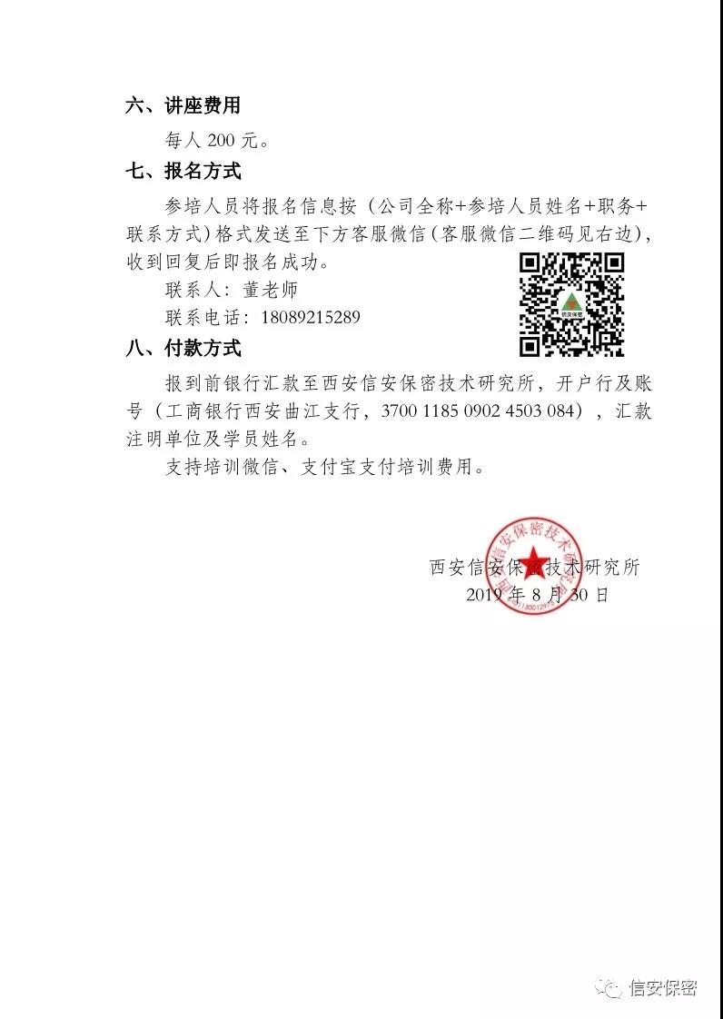 报名须知 收费标准 每人200元 付款方式 ◆ 报到前银行汇款至西安信安保密技术研究所,开户行及账号(工商银行西安曲江支行,3700 1185 0902 4503 084),汇款注明单位及学员姓名。 ◆ 支持培训微信、支付宝支付培训费用。 报名方式 ◆ 参培人员将报名信息按(公司全称+参培人员姓名+职务+联系方式)格式发送至下方客服微信,收到回复后即报名成功。 ◆ 联系人:董老师 ◆ 联系电话:18089215289