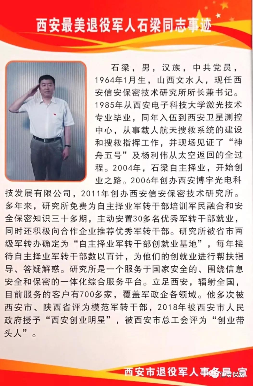 10月23日下午,西安市政府组织召开退役军人工作会议暨“最美退役军人”表彰大会。西安市肖西亮副市长、西安警备区王伟副司令员、西安市政府肖争光副秘书长、西安市退役军人事务局惠应吉局长、西安市委政法委孙永涛副书记等领导同志及西安市委、市政府、区县各相关部门200多人参加了会议。我公司总经理石梁获此殊荣!他说道:“荣誉对我来讲,更是一种鞭策,我还需倍加努力,做出更多的成绩和贡献,实现更大的价值,不辜负政府、社会、群众对我的认可和信任。”