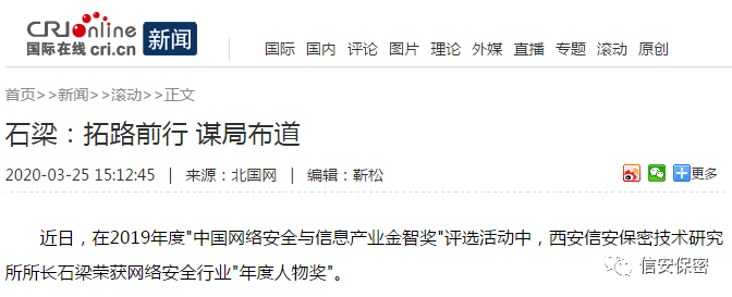 3月下旬,一篇名为“石梁:拓路前行,谋局布道”的文章被众多主流新闻媒体争相报道。文章中提到的不是别人,正是我们研究所所长石梁。 在2019年度“中国网络安全与信息产业金智奖”评选活动中,我研究所所长石梁荣获网络安全行业"年度人物奖",这也是他连续第四次获此殊荣。 多年来,石梁所长已为近千个单位提供了高质量的保密技术服务和信息安全保密讲座,并帮助数百家"民参军"企业取得了相关资质。2019年他对外授课128场,足迹遍布全国20多省市,行程15万公里,多次被评为优秀共产党员和陕西省级、西安市模范军转干部。